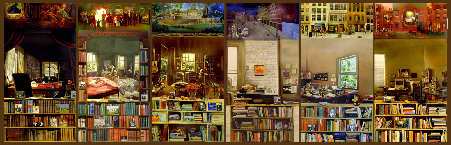 Tafanejant el blog de Roger Bartra he descobert, doncs, el quadre de grans dimensions d’Elena Climent i que porta per títol At Home With Their Books. He quedat trasbalsat. Quina composició més bella, quina originalitat, quin resum d’intel·ligència per mostrar-nos les cambres de Washington Irving, Edith Wharton,Zora Neale Hurston, Frank O’Hara, Jane Jacobs i Pedro Pietri. En fi, l’univers de felicitat que acompanya els llibres quan aquests són gairebé una mena de biografia d’un mateix. Per no repetir-me, em permeto reproduir aquí dos breus escrits («Els llibres i la conquesta de la felicitat» i «La lectura del primer llibre») que vaig publicar al meu llibre Manual de Sensacions (Angle 2004, pàg. 69-70 i 71-73). Tanmateix, els he barrejat i els he modificat una mica per donar més coherència a la lectura actual. Al capdavall, no serà la primera vegada que els modifico, perquè, de fet, els vaig escriure per ser dits de paraula al programa matinal de Catalunya Ràdio que realitzava i presentava a l’estiu el bon amic Gaspar Hernández. Com ens divertíem, senyor!