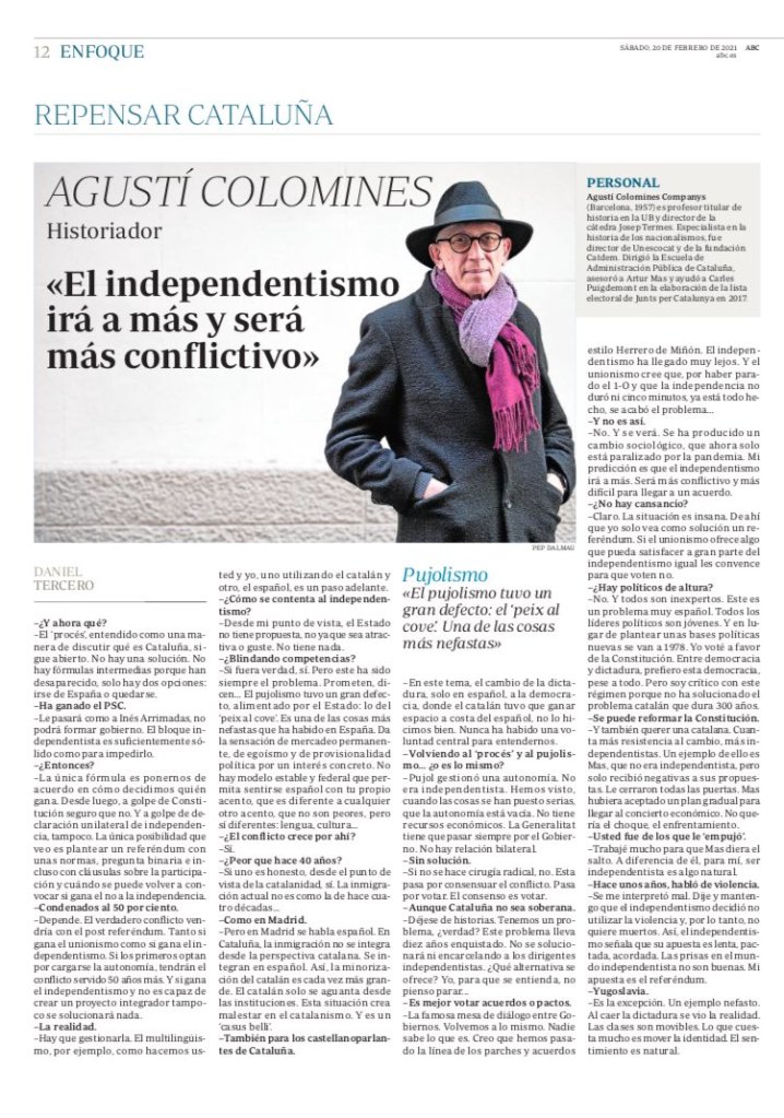Entrevista de Daniel Tercero a Agustí Colomines, publicada en ABC el 20/02/2021
