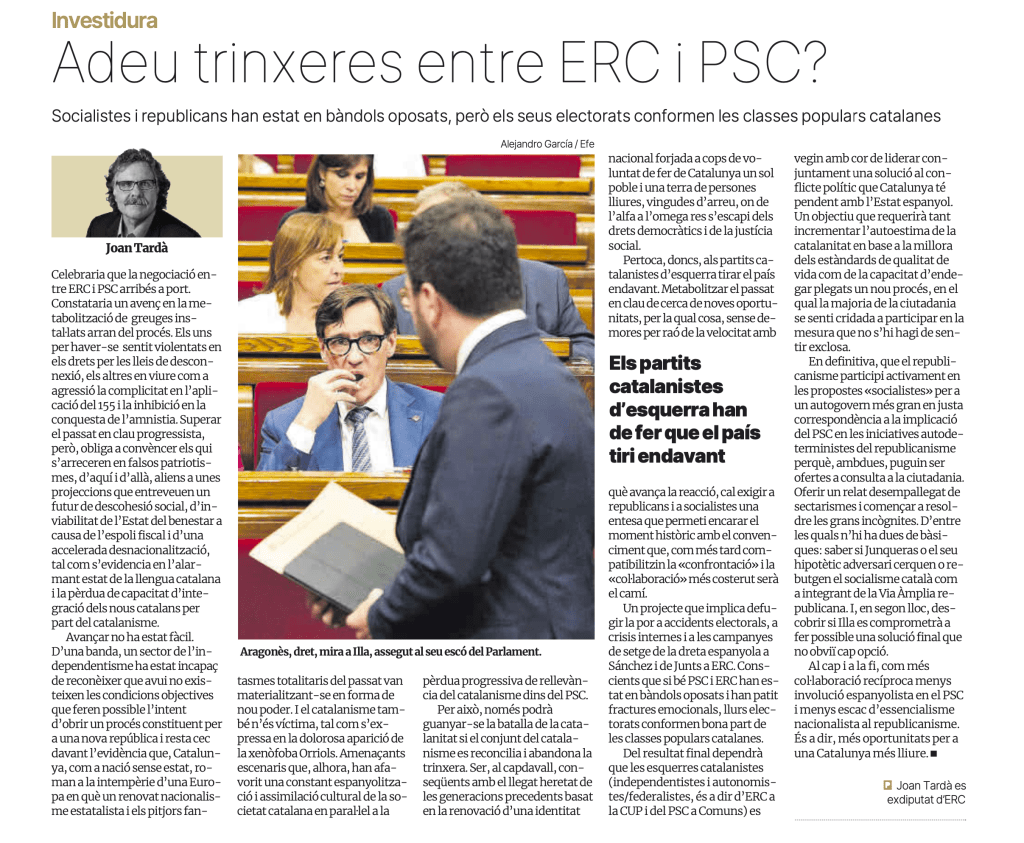 M’afanyo a dir que totes les opinions són respectables, si bé els antics grecs ja ens advertiren que l’opinió és el contrari de la veritat. Les certeses absolutes són del gust de qui no sap debatre. Faig aquest advertiment perquè les notes que poden llegir a continuació deriven de la lectura de l’article “Adeu trinxeres entre ERC i PSC?” que Joan Tardà va publicar a El Periódico ahir, 26 de juliol. Tardà és un home de conviccions profundes, que del 2017 ençà defensa que cal “girar full”, tot i que ell no empra aquesta imatge tan cara a Salvador Illa, per superar la dècada sobiranista, que altres anomenen pejorativament “procés”. Tant si utilitza l’expressió com si no, això no és obstacle perquè, a la pràctica, la conclusió de Tardà sigui la mateixa: que l’independentisme canviï de paradigma i retorni al catalanisme. No és pas un gir qualsevol, perquè té la seva transcendència.